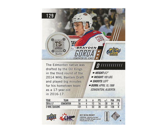 Brayden Gorda Autographed 2017-18 Upper Deck CHL #129 Hockey Card