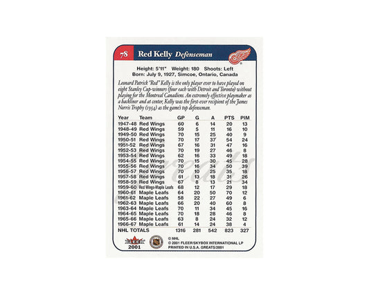 Red Kelly Autographed 2001 Fleer Greats of the Game #78 Hockey Card Inscribed "HOF-69"