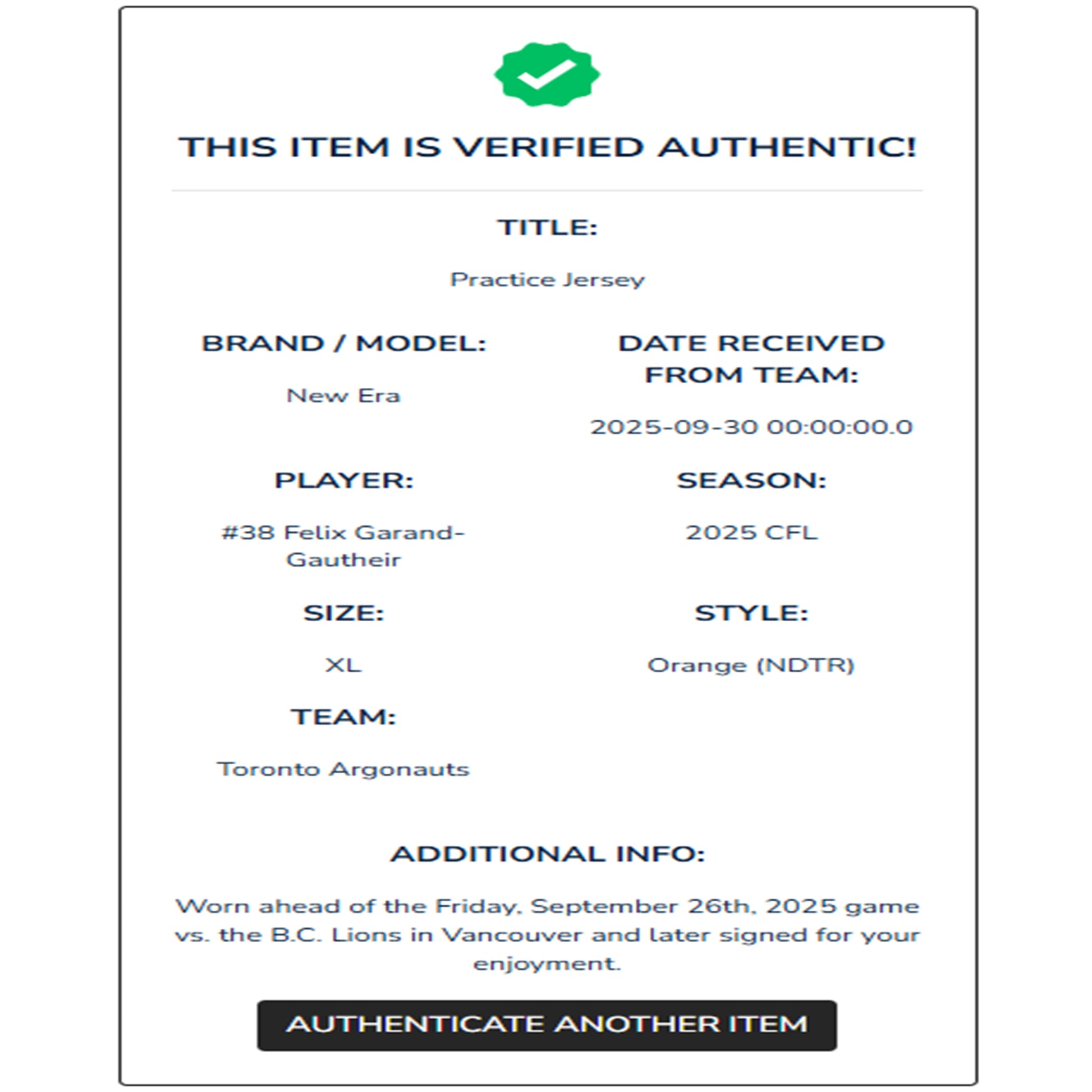 - This jersey was worn ahead of the September 26th, 2025 game vs the B.C. Lions in Vancouver.