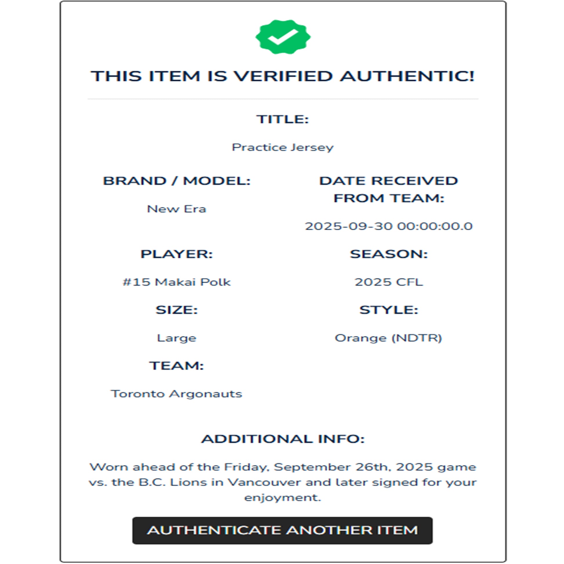 Makai Polk Autographed & Player-Worn Toronto Argonauts Orange Jersey